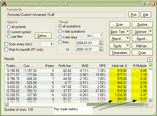 The code is basically very similar to Example 2. There are only a few differences. First is that we call the Backtest method with the NoTradeList parameter set to 1. This way, we disable default trade listing, so we can add custom per-trade metrics and list trades later by calling the ListTrades method. Later, we iterate through trades and calculate risk based on trade entry value and the amount of max. loss stop used. The RMultiple is then calculated as trade profit divided by the amount risked per trade. Both risk and R-multiple are then added as custom per-trade metrics (note that we are calling the AddCustomMetric method of Trade object here). Later on, we do the remaining calculations. At the end of the custom backtest procedure, we are adding a custom backtest metric (this time calling the AddCustomMetric method of the Backtester object), and after that, we trigger listing of the trades using the ListTrades method. For simplicity, we ignore any open positions that may have been left at the end of the analysis period. The only change to the trading system itself was the addition of a maximum loss stop (ApplyStop line).
