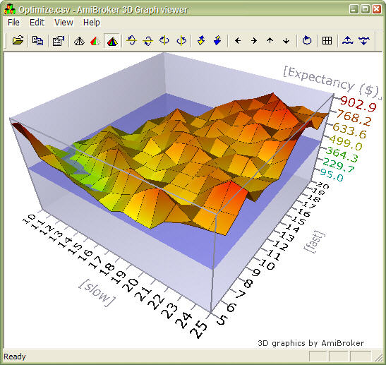 When you click the custom metric column, the optimization results will be sorted by your own metric, and you will be able to display a 3D chart of your user-defined metric plotted against optimization variables.