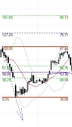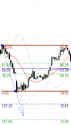 The Fibonacci Extensions toolbar button and drawing tool work much like the Andrews' Pitchfork drawing tool. First, click on the Fibonacci Extension button on the toolbar. Then, click three times, once on each of the points that are involved in the Fibonacci Extension. The first click should be on the starting point of the initial trendline. The second click should be on the ending point of the initial trendline. The third click should be on the ending bar of the retracement period.