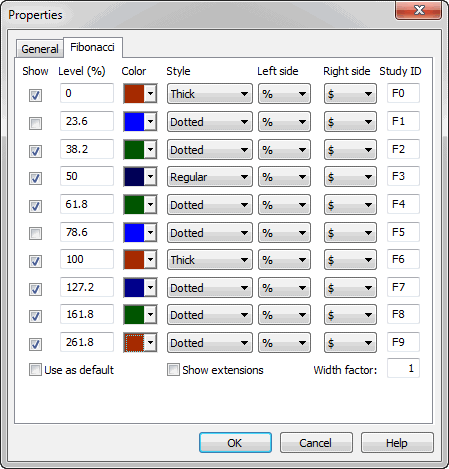 The properties window is used to change the square levels, color, style, thickness, and defaults. Click on any of the Gann Square Show entries to add or remove lines. Click in the square Color box to change the line color. Click on Style combo boxes to change the line style. Check the Use as Default box to save the settings as the default for all subsequent Gann Squares that are drawn. The "Left side" and "Right side" columns control the display of text that appears on the left and right side of the Gann lines. "Empty" means no text, % means percentage level, $ means dollar (point) level. "Study ID" column defines a study identifier that can be used in your custom formulas to detect crossovers. You can change these IDs if required by simply editing these fields. For more information on Study IDs, check Tutorial: Using Studies in AFL Formulas