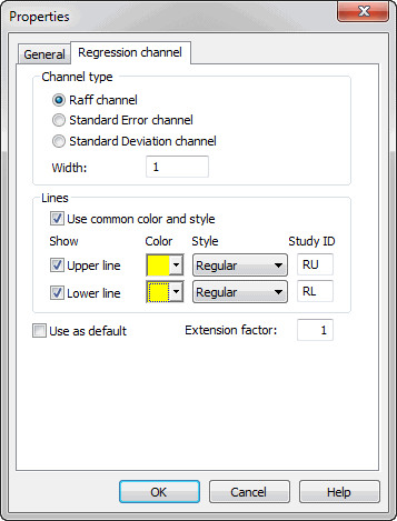 If the Use common color and style box is marked, channel lines use the same style and color as the regression (middle) line. If it is not marked, you can set separate colors and styles for upper and lower channel lines. You can also completely switch off upper and lower channel lines by unticking Show Upper line and Show Lower line boxes.