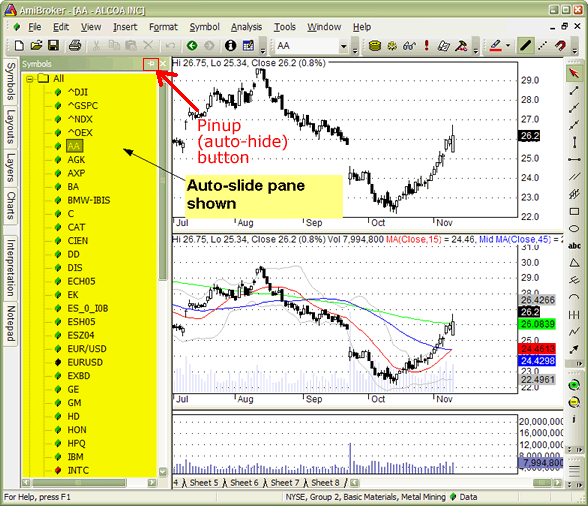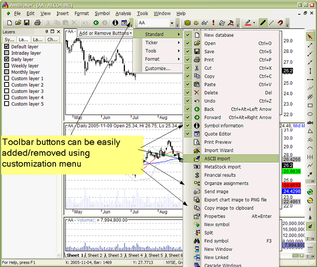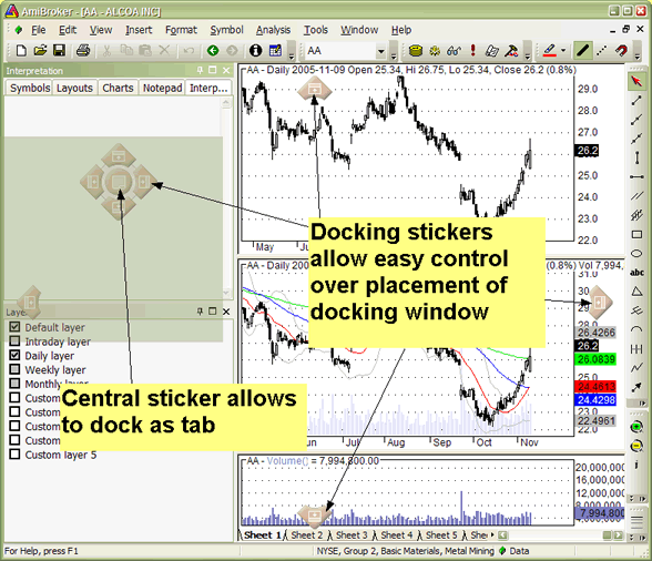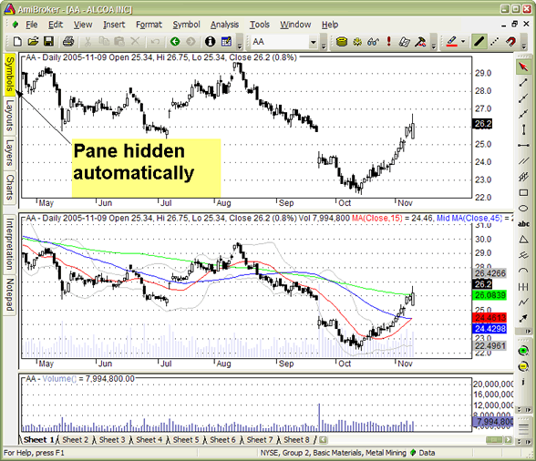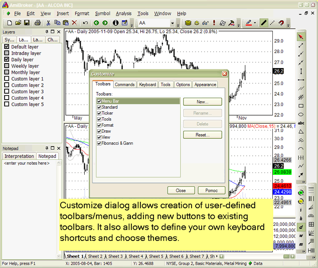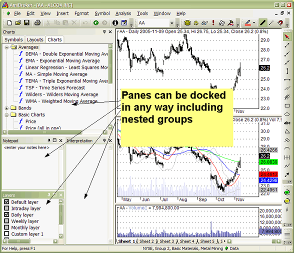 A newly introduced customizable user interface has several nice features that allow complete control over the look and feel of the AmiBroker user interface.