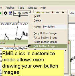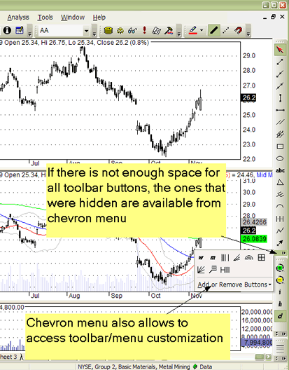 The 'Add or Remove Buttons' submenu allows you to quickly show or hide toolbar buttons according to your preference. In customization mode (when you enter it using Tools->Customize), you can also move buttons around to change the order in which they appear, and you can also resize edit fields and combo fields (such as the ticker selection field) by selecting them first and resizing the border that will appear after making the selection.