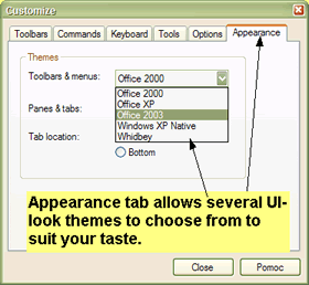 The new user interface allows full user control over the appearance, layout, and position of all toolbars, buttons, and menus. It allows you to add your own buttons, remove or rearrange existing ones. You can also define or redefine new or existing keyboard shortcuts. All these customization features are available from the Tools->Customize menu or from the Customize chevron menu.
