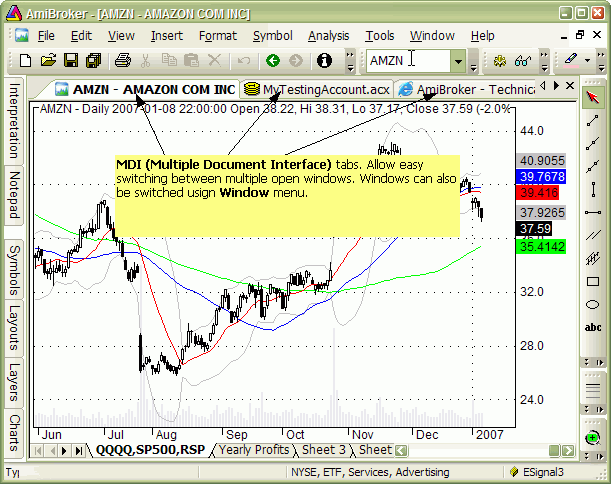 Historical note: In pre-4.90 versions, to switch documents, you would need to use the Window menu. Now, in addition to that, you can use tabs. But this is just a convenience feature. More info at: http://en.wikipedia.org/wiki/Tabbed_Document_Interface (Note that Wikipedia links describing TDI/MDI are somewhat outdated, and AmiBroker actually combines the advantages of both TDI and MDI approaches (for example, you can tile windows in AB's TDI))