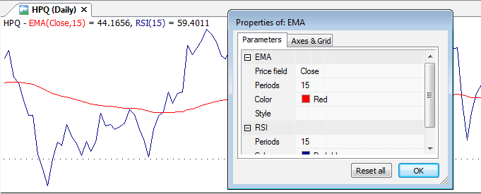 The indicator below allows you to check how the parameters work in the custom code. You can change settings from the Parameters dialog.