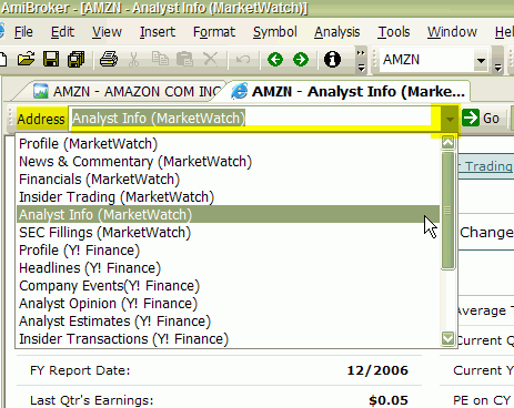 To display any pre-defined web research page, simply click on the drop-down arrow in the Address combo box and select an item from the list. Once you do so, the web page relevant to the currently selected symbol will be automatically displayed.