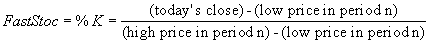 The Stochastic Oscillator always ranges between 0% and 100%. A reading of 0% shows that the security's close was the lowest price that the security has traded during the preceding x-time periods. A reading of 100% shows that the security's close was the highest price that the security has traded during the preceding x-time periods. When the closing price is near the top of the recent trading range (above 80%), the security is in an overbought condition and may signal a possible correction. An oversold condition exists below %20. Prices close near the top of the range during uptrends and near the bottom of the range during downtrends.