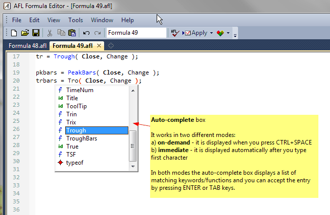 The automatic completion feature (available when you press CTRL+SPACE key combination) finishes typing your functions and reserved variables for you, or displays a list of candidates if what you've typed has more than one possible match. You can select the item from the list using up/down arrow keys or your mouse. To accept the selection, press RETURN (ENTER). You can also immediately type a space (for variables) or an opening brace (for a function), and AmiBroker will auto-complete the currently selected word and close the list. To dismiss the list, press the ESC key.