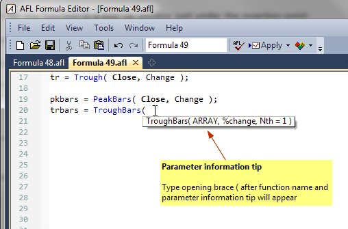 AmiBroker displays the complete declaration for the function in a pop-up window just under the insertion point.