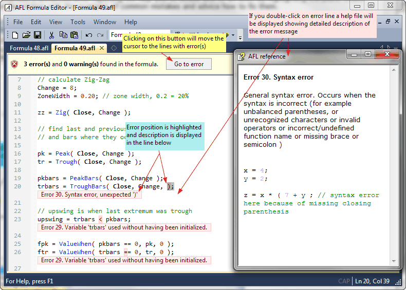 When you make an error in your formula, AmiBroker's enhanced error reporting will help you to locate and fix it by highlighting the place where the error occurred and displaying an extended error description with examples of common mistakes and advice on how to fix them. In version 5.80, descriptions of errors are displayed in-line with the code.