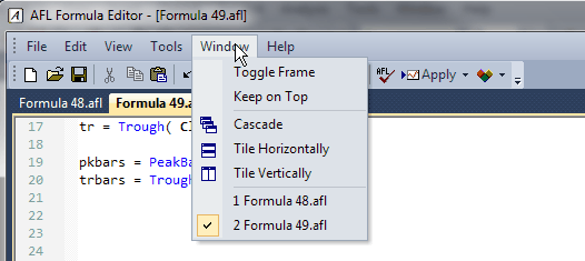 The user may also turn on the Window->Keep On Top feature that keeps the editor window on top of the AmiBroker main frame.