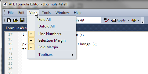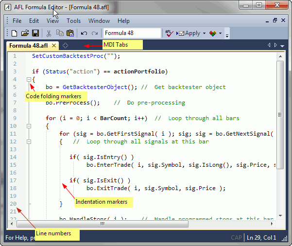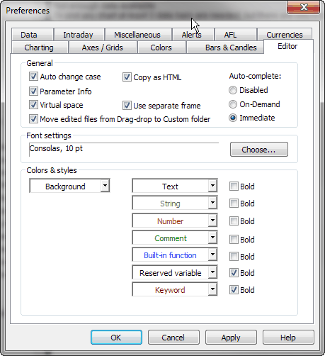 AmiBroker's AFL editor features user-definable syntax highlighting that automatically applies user-defined colors and styles to different language elements like functions and reserved variable names, strings, numbers, comments, etc. This feature greatly simplifies code writing. You can modify the coloring scheme in Preferences window.